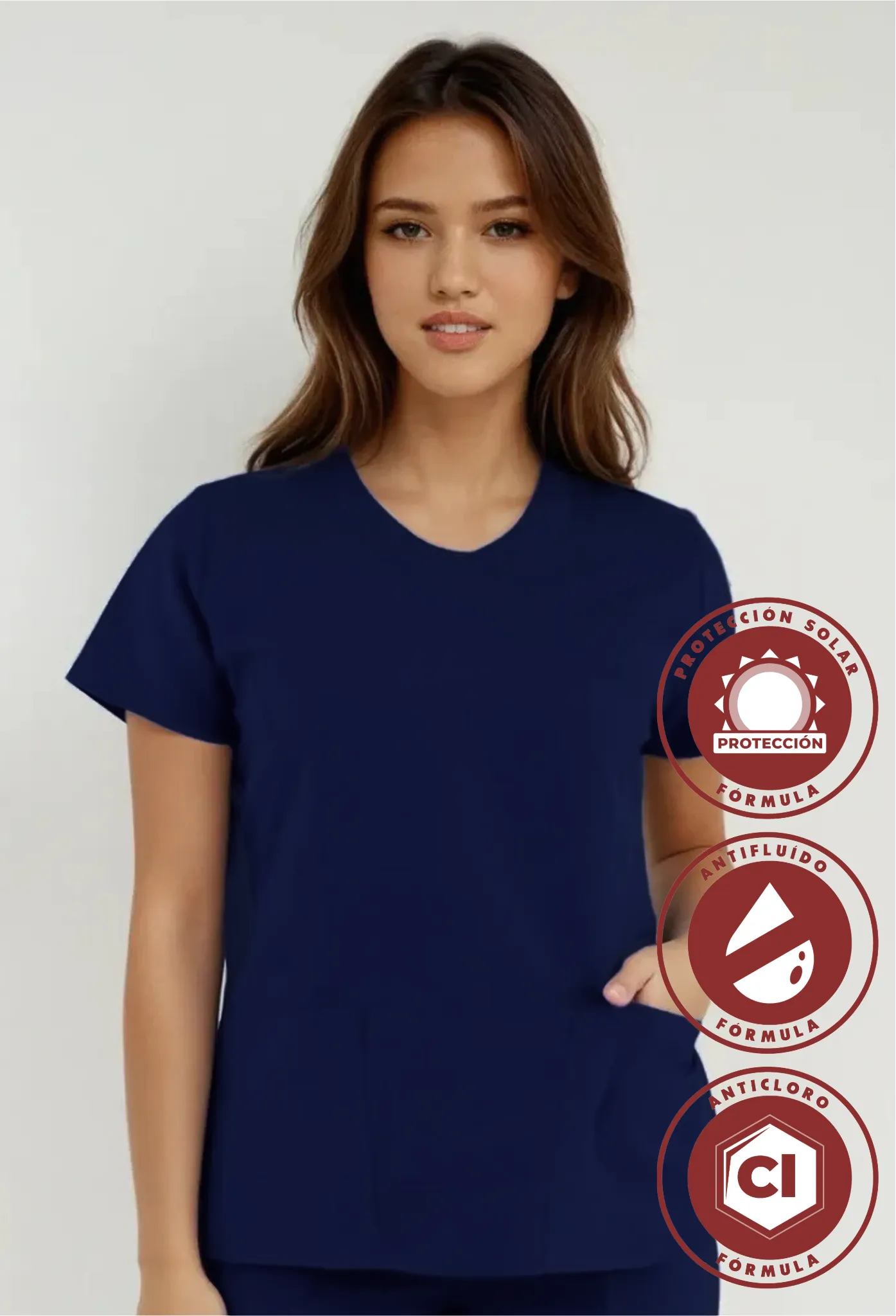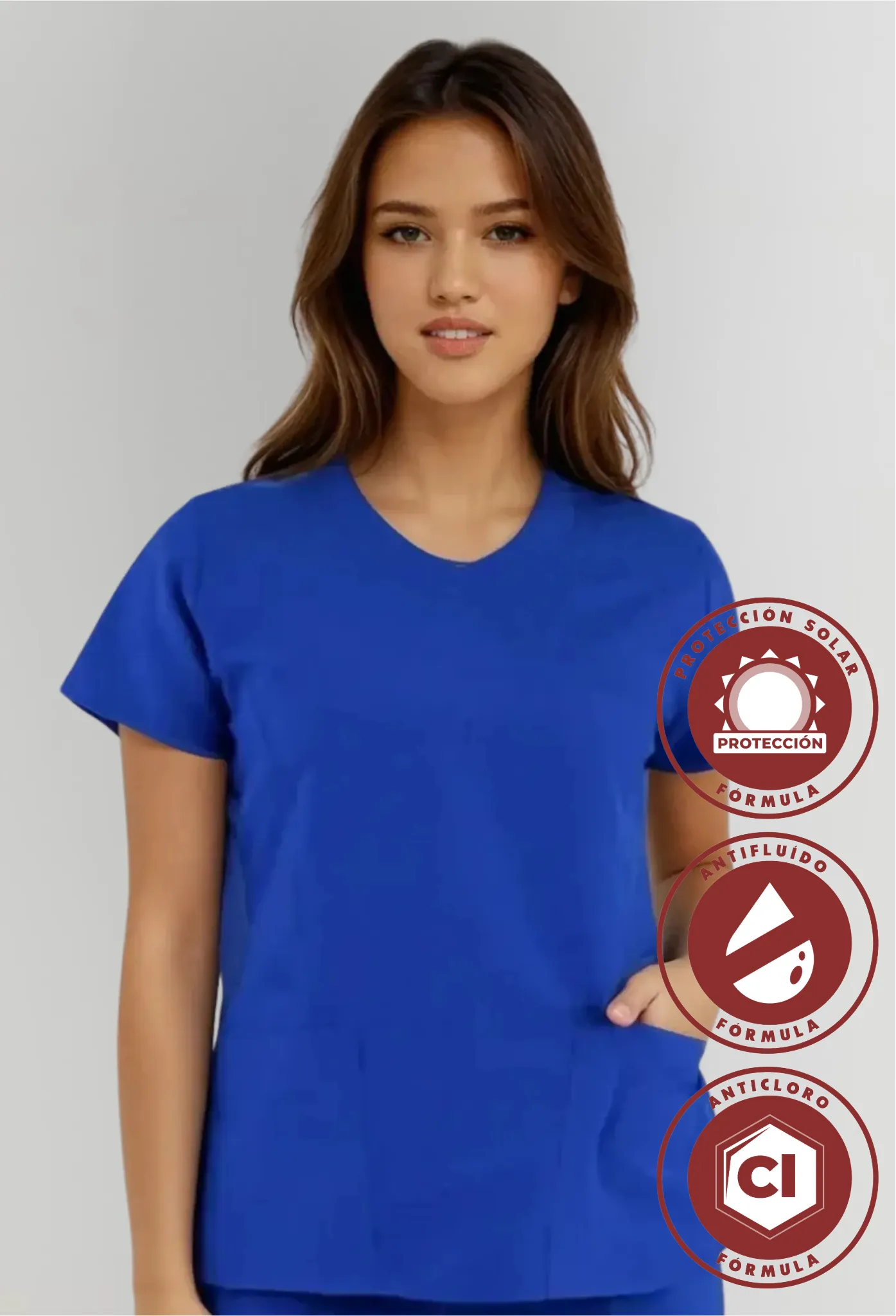 Ideal para enfermería, laboratorio, limpieza y más. Esta filipina combina tecnología antifluido, anticloro y protección solar en un diseño cómodo. Cuenta con dos bolsillos funcionales en los costados y elástico ajustable en la espalda que permite libertad de movimiento sin perder ajuste.